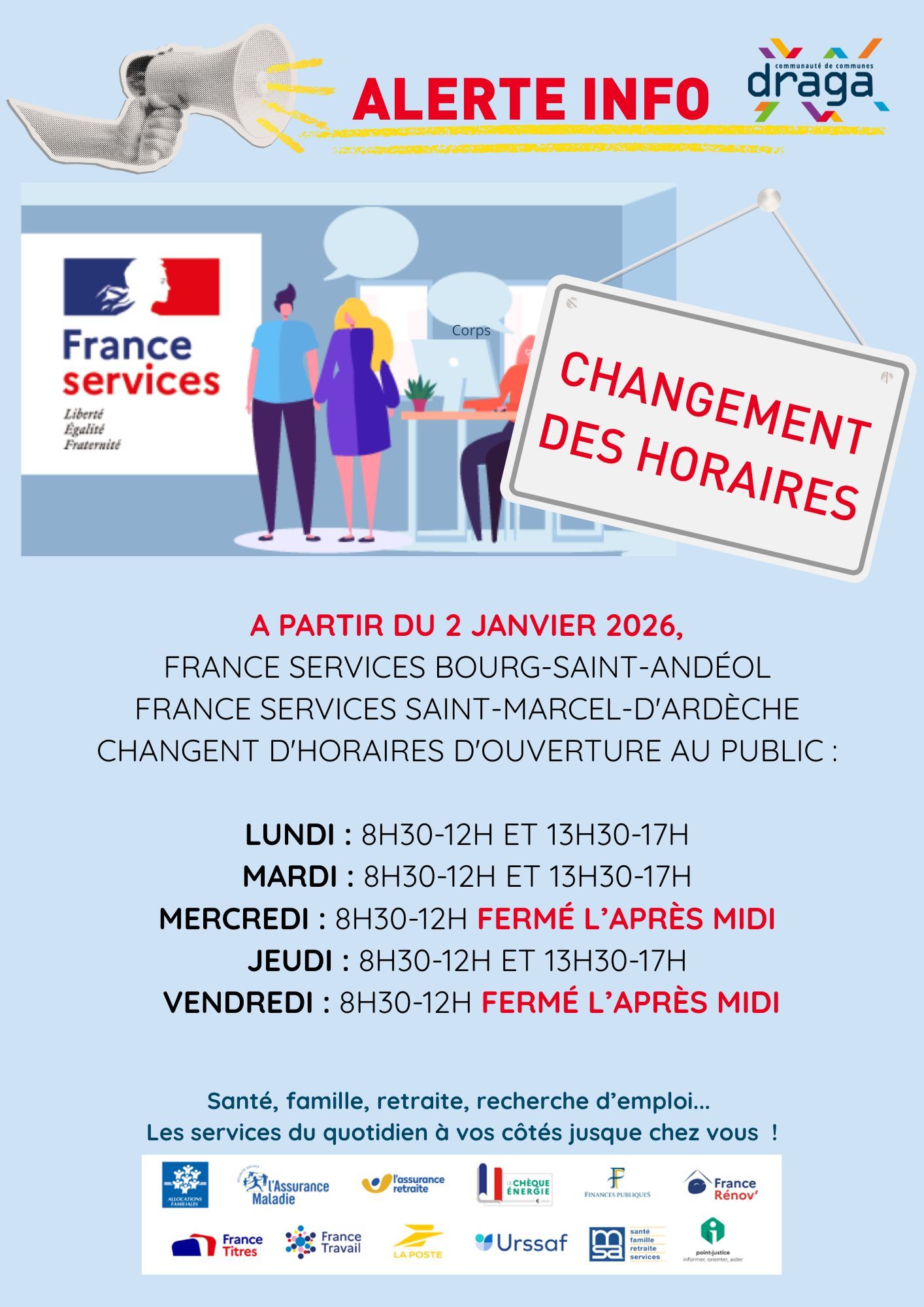 Les horaires d'ouverture des France Services de Bourg-Saint-Andéol et Saint-Marcel d'Ardèche sont modifiés depuis le 2 janvier 2026.