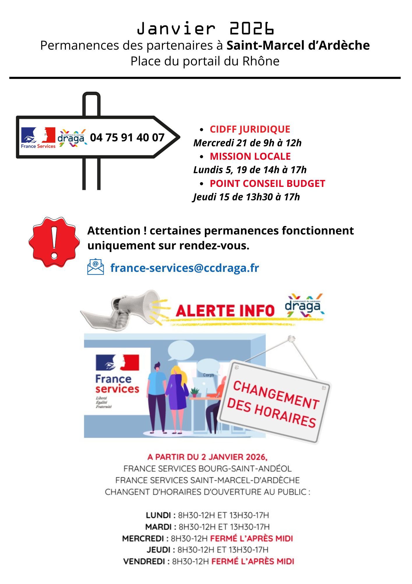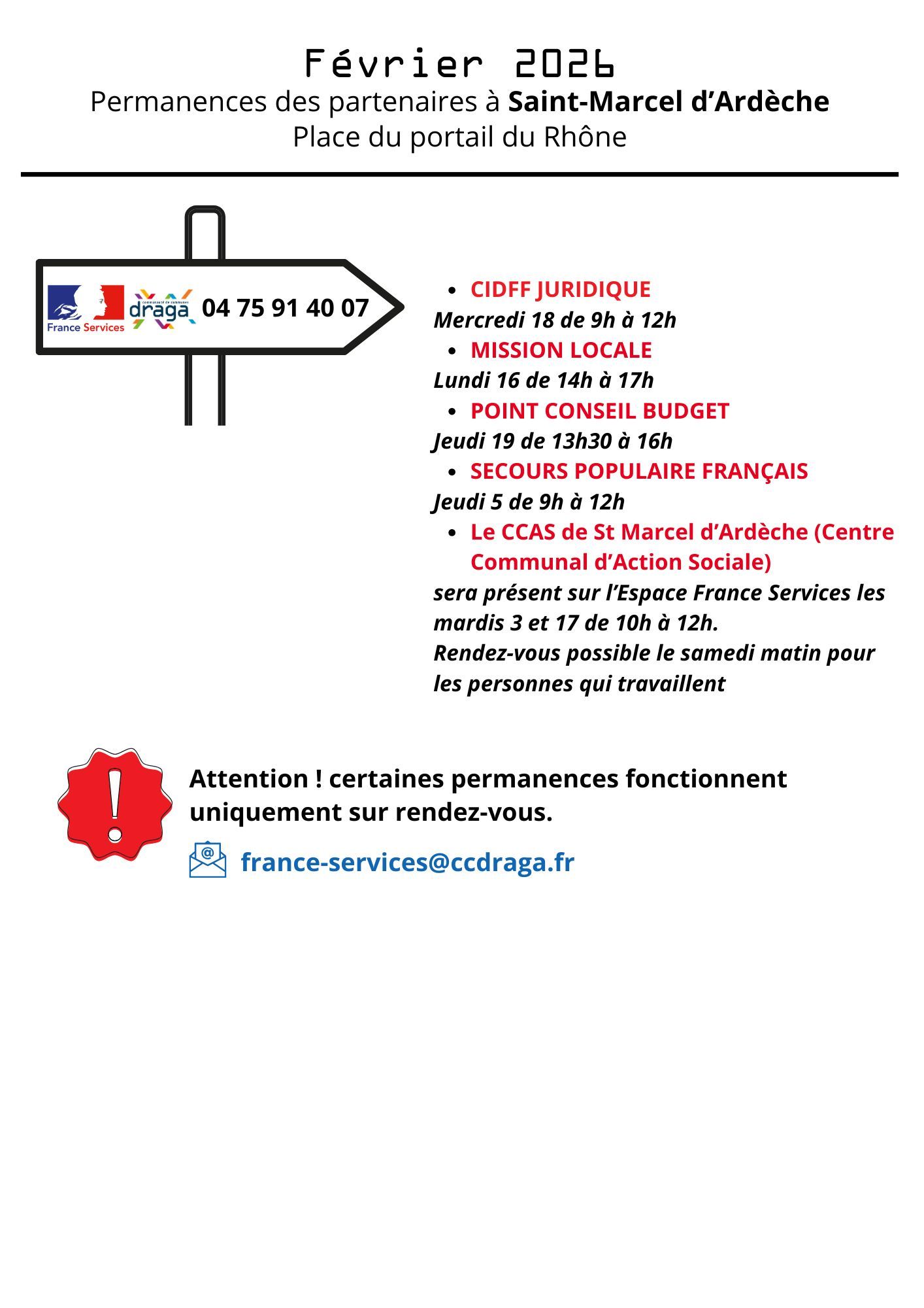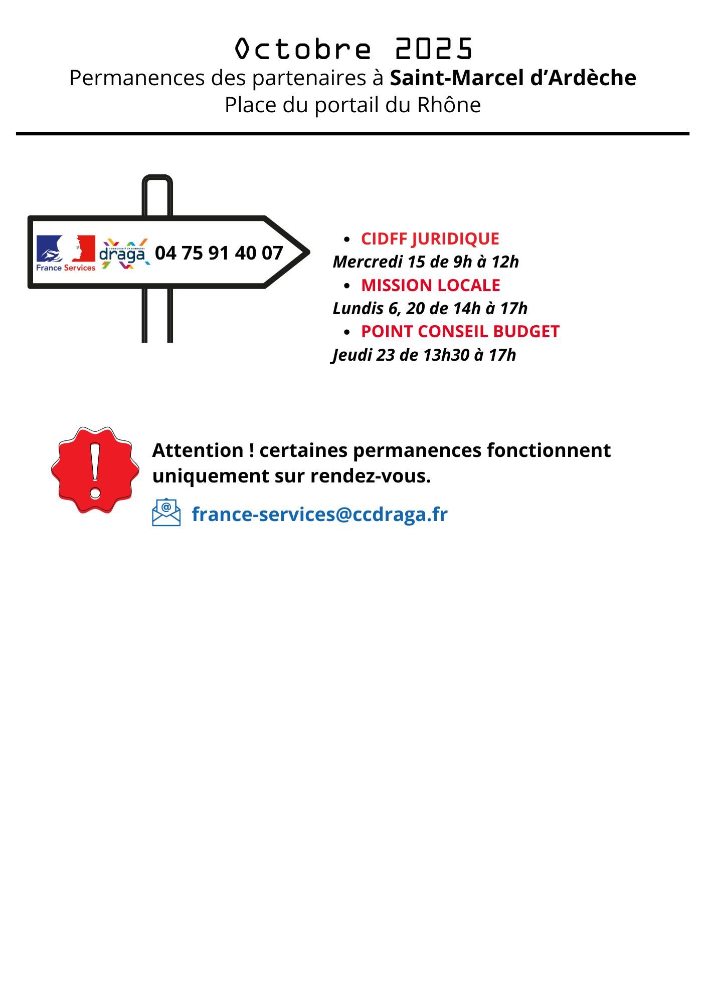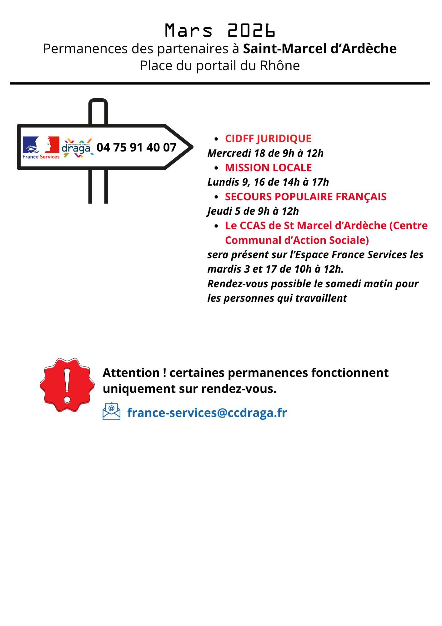 Chaque mois, les permanences des partenaires se tiennent 2 avenue du Maréchal Leclerc à Bourg-Saint-Andéol ou place du portail du Rhône à Saint-Marcel d'Ardèche.
