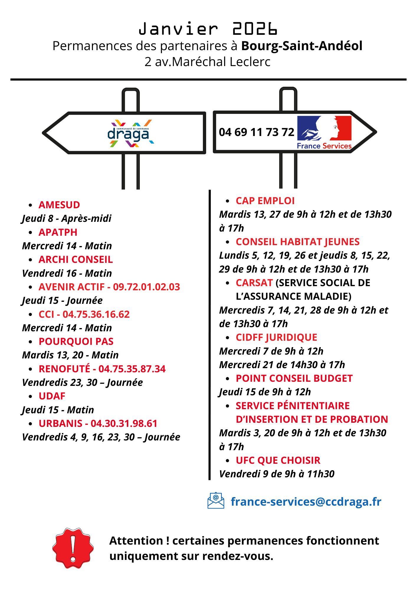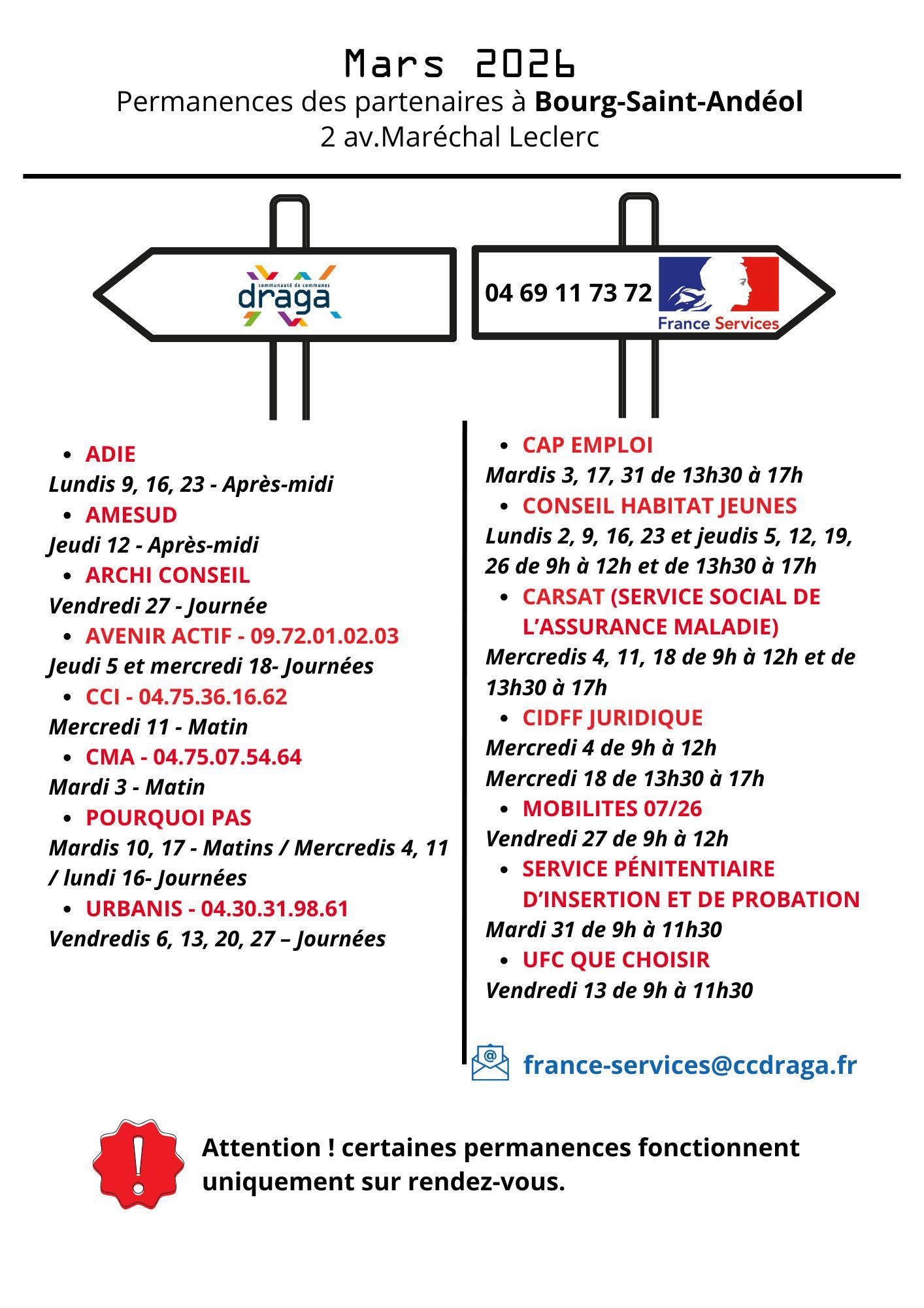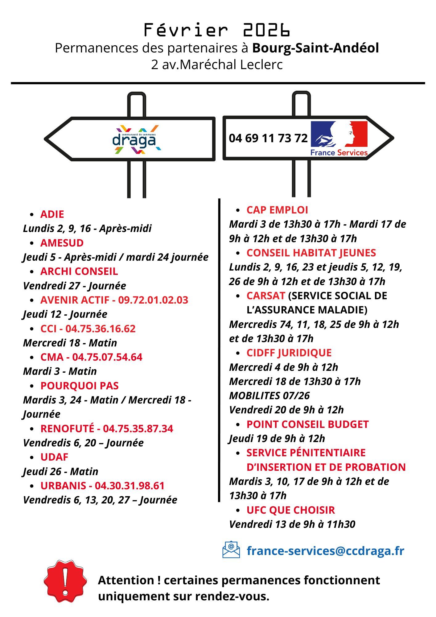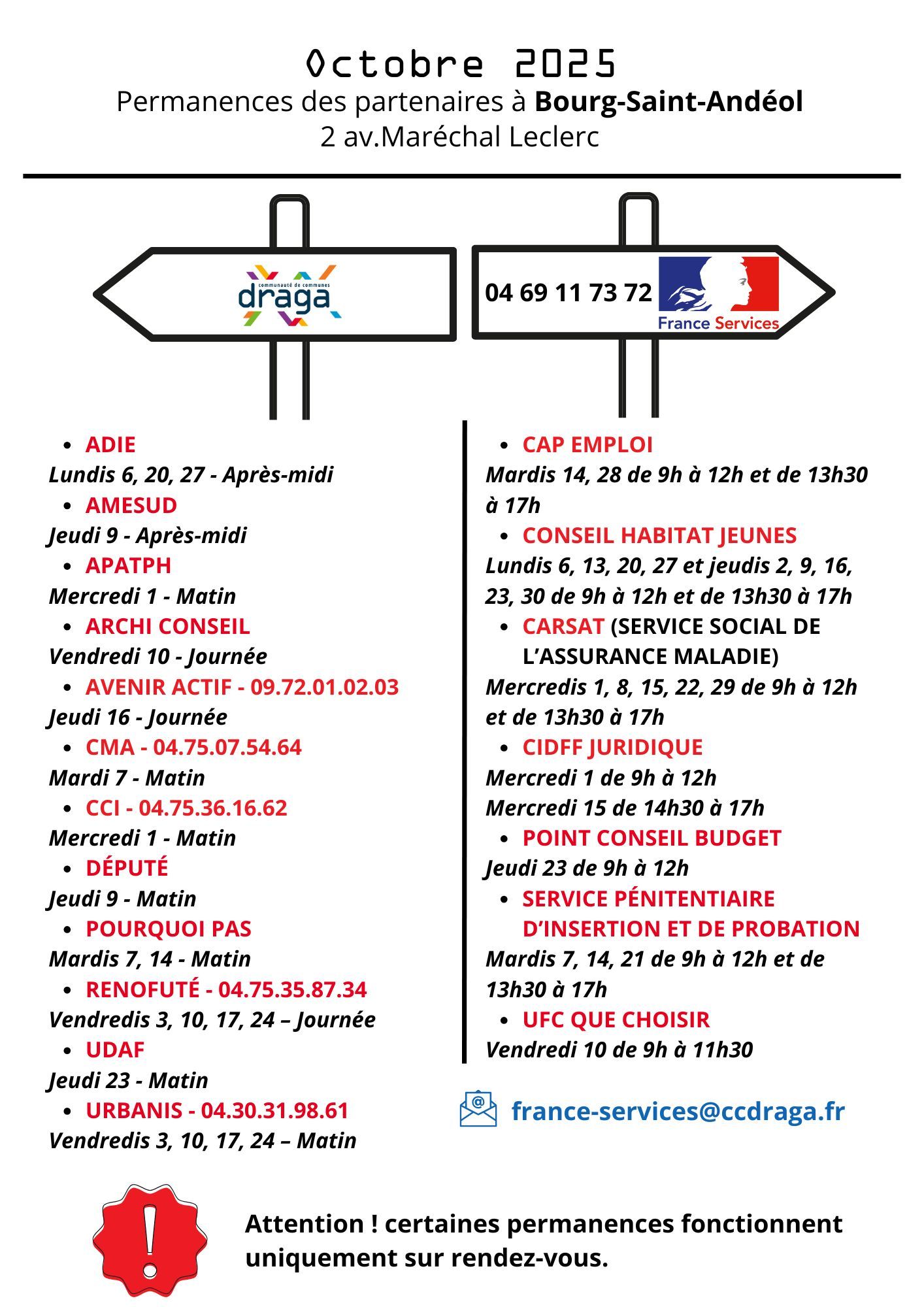 Chaque mois, les permanences des partenaires se tiennent 2 avenue du Maréchal Leclerc à Bourg-Saint-Andéol ou place du portail du Rhône à Saint-Marcel d'Ardèche.